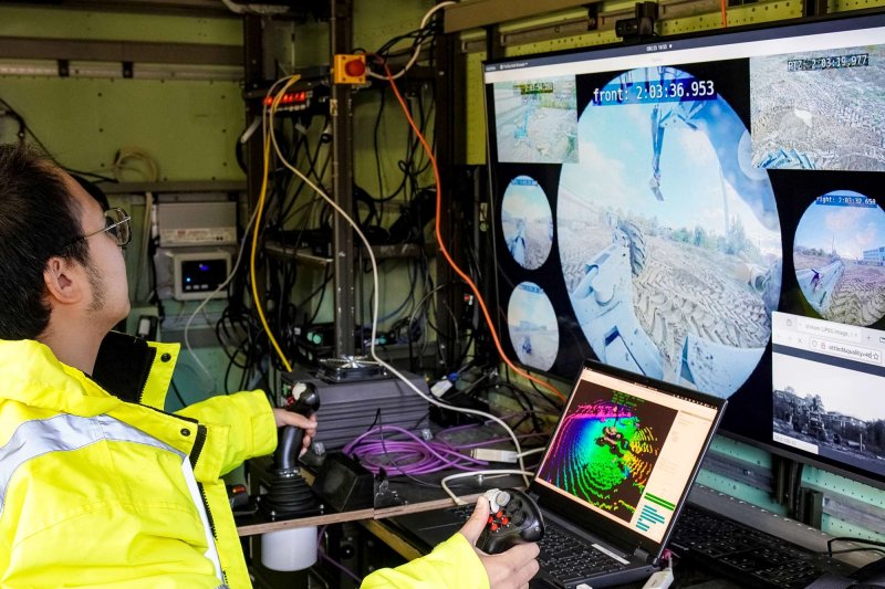 The autonomous excavator ALICE from ROBDEKON enables visitors to perform teleoperated barrel grasping. The excavator in Karlsruhe sends live camera images and recognized barrels online to Bremen. Visitors select a barrel, which the excavator grasps using 3D estimation.