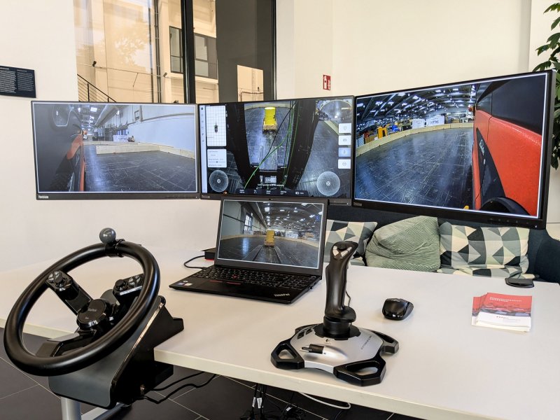 The teleoperation of the vehicle is carried out via video transmission, which supports the operator in transporting the hazardous substances safely and precisely with the forklift. During the pilot tests, the view often wanders to the real vehicle next to the control center during teleoperations. What needs to be considered and done if this option is not available is part of the research being carried out by the ROBDEKON competence center. Central questions are also: How can the senses and perception of a human operator be optimally addressed? Which assistance systems make it easier for operators to carry out their tasks? What can already be carried out automatically and autonomously? Concrete pilot tests are also part of the project.